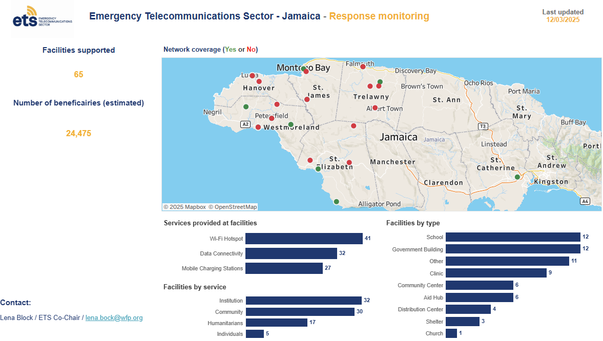 The Emergency Telecommunications Sector (ETS) is supporting the Government-led response in Jamaica, coordinated by the Office of Disaster Preparedness and Emergency Management (ODPEM) with support from the Caribbean Disaster Emergency Management Agency (CDEMA). Relief efforts are focused on the hardest-hit Parishes, where telecommunications and power services remain severely disrupted. Mobile network operators continue to report outages across multiple locations, underscoring the urgent need for coordinated connectivity support.